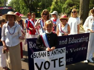Here is our merry band, the League of Women Voters, with “Susan B Anthony” at our helm.