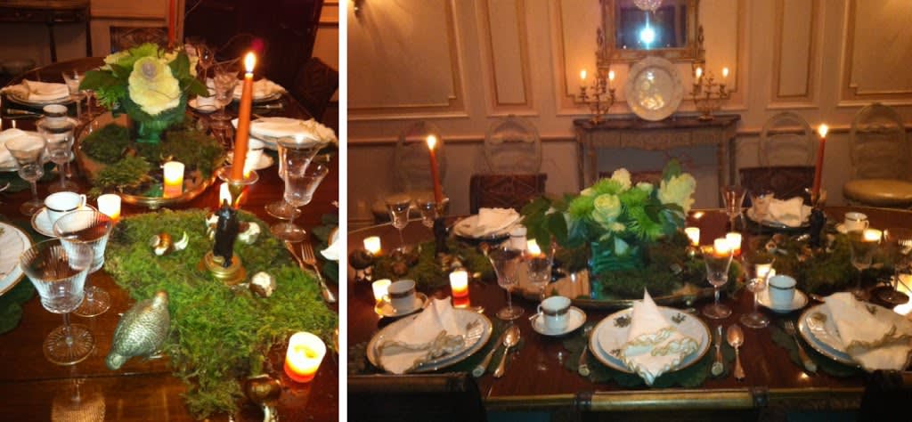 The theme was staring at me from my foggy car windows. A winter wonderland! Why not? I had beautiful porcelain dinner plates with woodland animals on them, a collection of Asprey horn and sterling flatware, my St. Louis Apollo crystal, placemats that are blankets of “leaves” and gold trimmed linen napkins from Hoglands, another favored retailer in Greenwich.