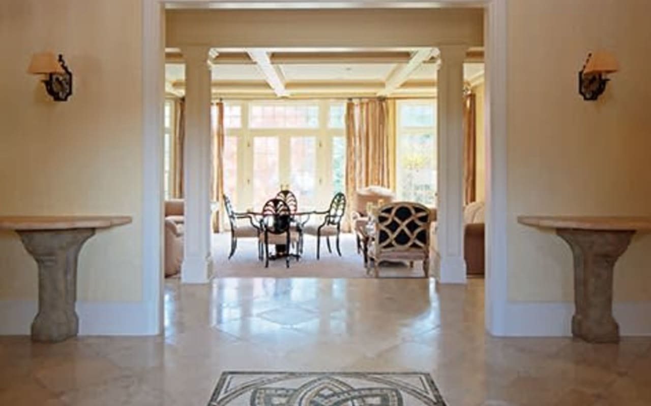The property just brought to market was the home to a couple with a serious passion for art and beauty. The custom detail and design work seen in everything from mosaic floors to marble bathrooms speaks of their love of architecture and decorating.